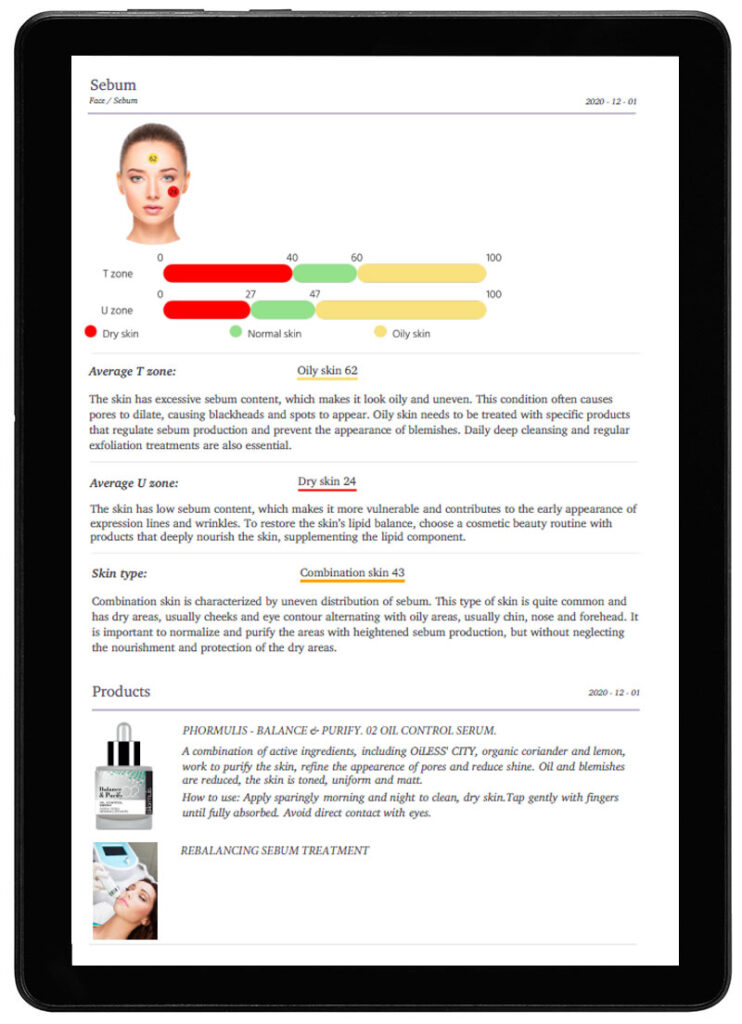 Skin analysis report delivered to smartphone, tablet (ioS e Android) or via email from device